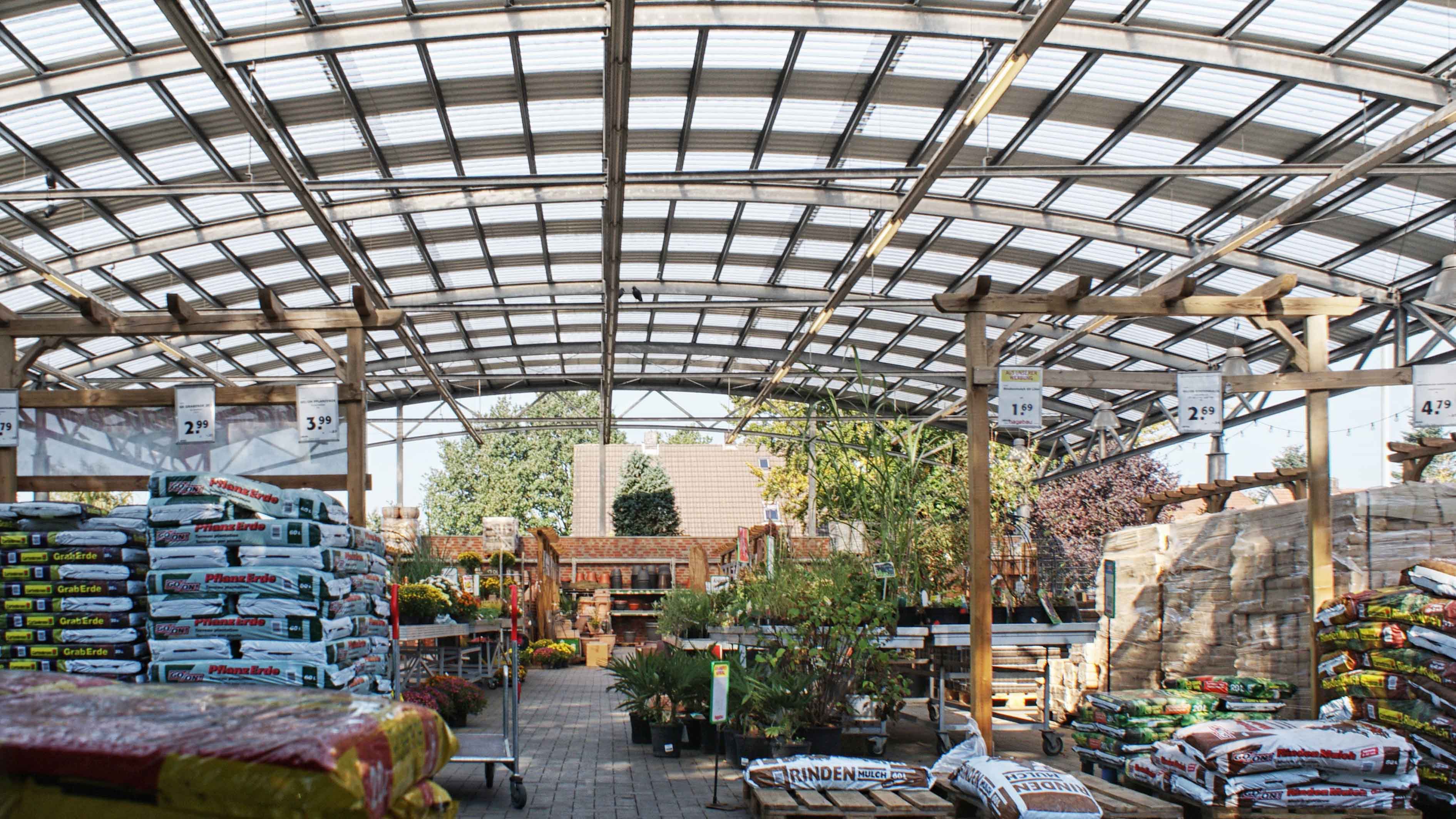Hagebaumarkt in Esens. Um- und Anbau des Hagebaumarktes in Esens mit Umgestaltung des Eingangsbereiches mit Vordach und Neubau einer überdachten, offenen Ausstellungshalle als Gartencenter mit architektonisch gestalteten, bogenförmigen Gitterträgern auf verzinkten Stahlstützen. Mehr Informationen.